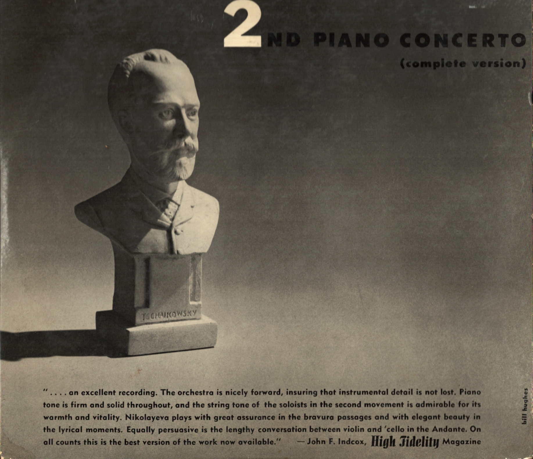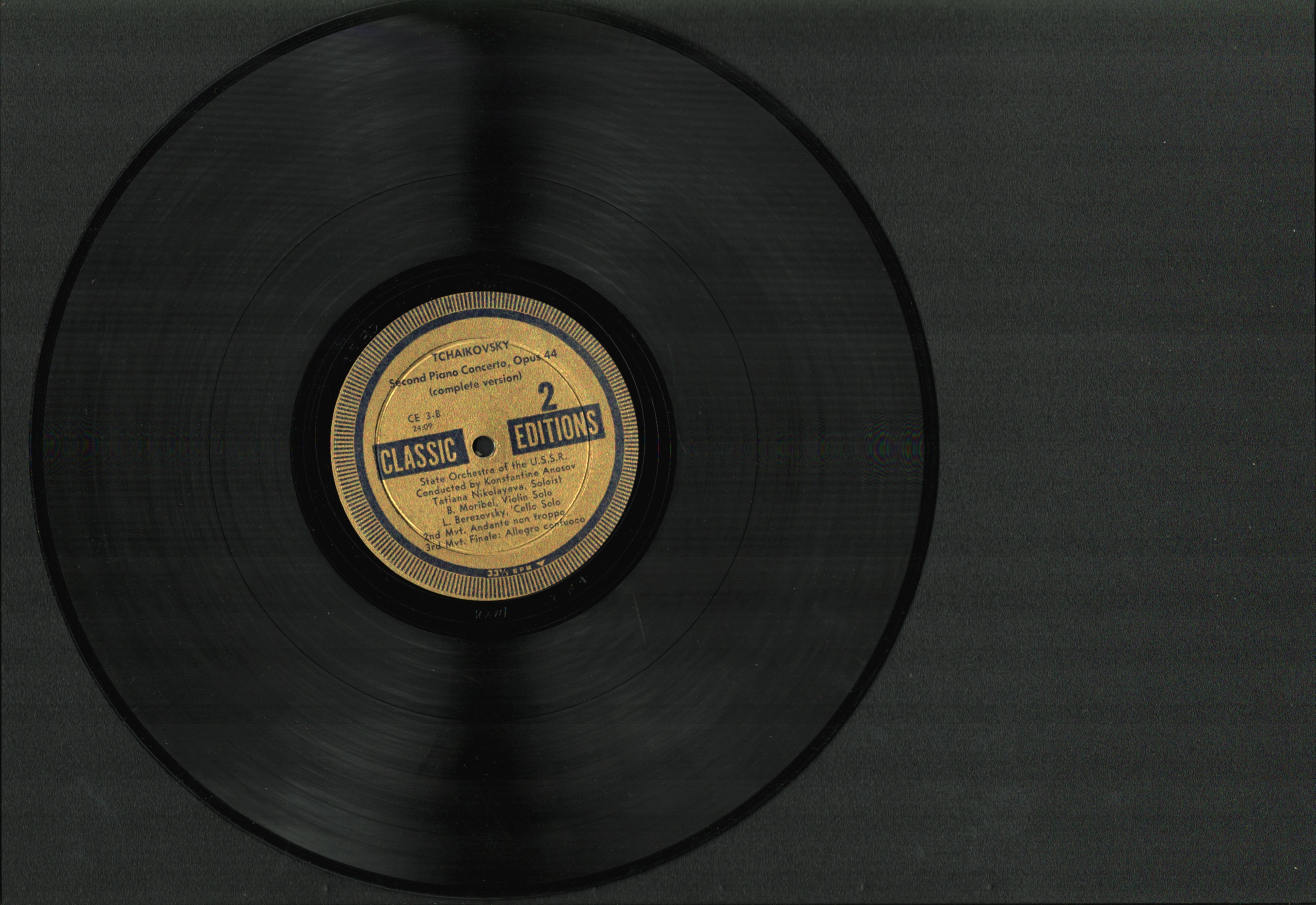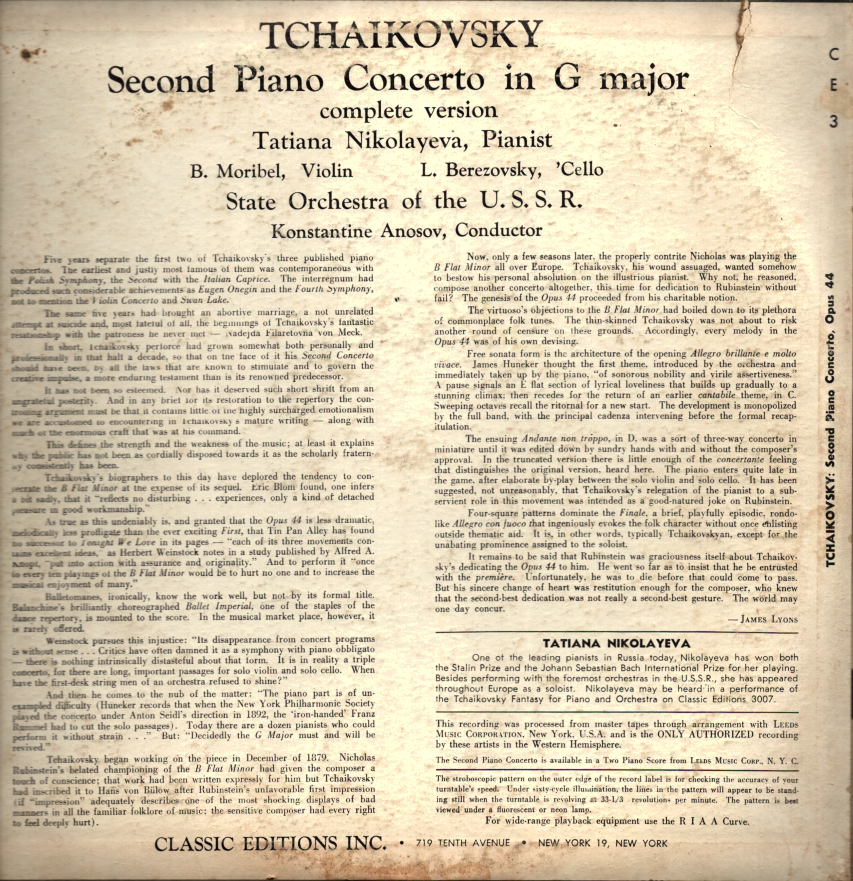 Tatiana Nikołajewa (1924–1993) była jedną z największych pianistek radzieckiego złotego wieku — laureatką Konkursu Bachowskiego w Lipsku (1950), muzą Szostakowicza, któremu towarzyszyła przy narodzinach jego 24 Preludiów i Fug, pierwszą ich wykonawczynią. Jej imię wyryto dwukrotnie na Tablicy Zasług Moskiewskiego Konserwatorium — raz jako pianistki, raz jako kompozytorki. Zachodnia publiczność odkryła ją późno; tym cenniejsze są ślady jej sztuki z lat pięćdziesiątych. To nagranie II Koncertu fortepianowego Czajkowskiego g-dur op. 44, zrealizowane z Państwową Orkiestrą ZSRR pod batutą Nikołaja Anosowa (1900–1962), ma szczególną wartość historyczną. Anosow — pedagog, kompozytor, dyrygent, ojciec Gennady'ego Rozhdestvensky'ego — całe życie spędził w ZSRR i nigdy nie przedostał się na Zachód; ogromna część jego nagrań do dziś spoczywa nieodkryta w archiwach radiowych. Ten egzemplarz to jeden z nielicznych śladów jego sztuki w zachodnim obiegu. Muzycznie płyta urzeka czymś dodatkowym: wykonywany jest tu II Koncert w wersji kompletnej — z nietkniętym Andante, gdzie skrzypce i wiolonczela stają się równorzędnymi solistami, tworząc z fortepianem coś bliższego triu z orkiestrą niż klasycznemu koncertowi. Przez dziesięciolecia większość pianistów grała wersję skróconą Aleksandra Silotiego, pozbawioną tych kart partytury; Nikołajewa zagrała utwór tak, jak napisał go Czajkowski. Wydawnictwo Classic Editions Inc. (Nowy Jork, nr kat. CE 3) podkreśla na okładce, że jest to jedyna autoryzowana zachodnia edycja tego nagrania — wydana z taśm-matek za licencją Leeds Music Corporation. Recenzent pisma „High Fidelity" uznał je za „najlepszą dostępną wersję tego dzieła". Egzemplarz nienotowany w Popsike. Z kolekcji Wojciecha Padjasa – autora audycji „Muzyka spod Igły" w RMF Classic.