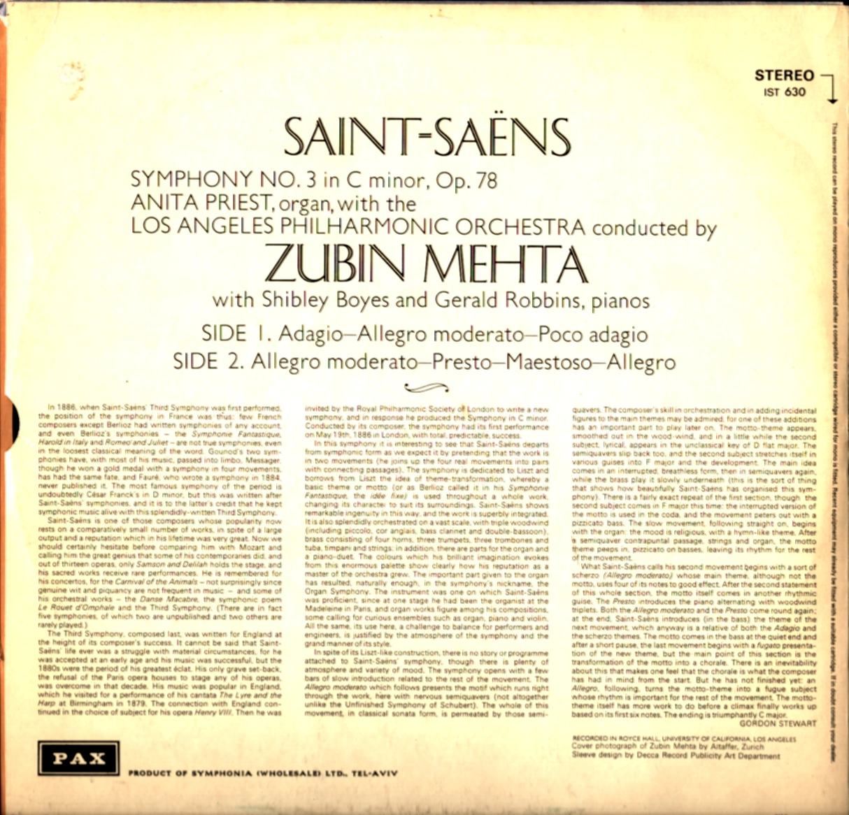 Symfonia nr 3 c-moll Saint-Saënsa — zwana „Z organami” — w nagraniu Zubina Mehty z Los Angeles Philharmonic Orchestra, zrealizowanym w 1970 roku w Royce Hall na Uniwersytecie Kalifornijskim. Przy organach Anita Priest. Tłoczenie izraelskie — wydane przez Symphonia Wholesale Ltd. z Tel Awiwu pod labelem PAX, z matrycy Decca. Geograficzna osobliwość w każdej kolekcji.