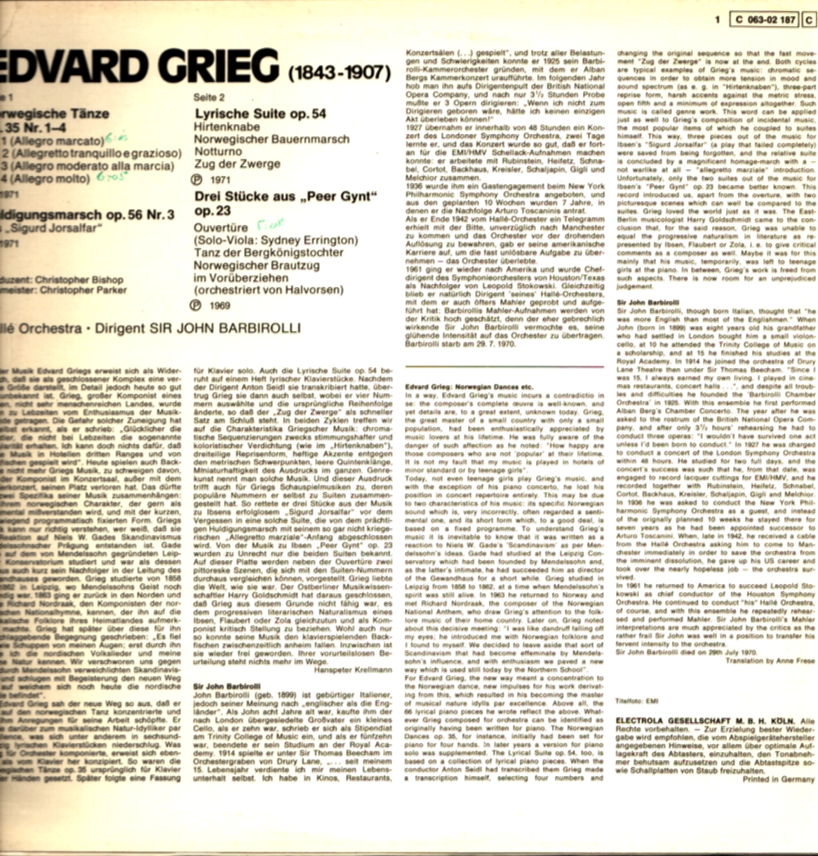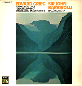 Sir John Barbirolli i Hallé Orchestra w programie złożonym z orkiestrowych miniatur Griega — Tańce norweskie op. 35, Marsz koronacyjny op. 56, Suita liryczna op. 54 i trzy fragmenty z muzyki do Peer Gynta. Barbirolli, urodzony w Londynie syn włoskiego muzyka, miał szczególne wyczucie dla skandynawskiego romantyzmu — jego nagrania z Hallé do dziś uchodzą za referencyjne w tym repertuarze. Niemieckie tłoczenie EMI Electrola.