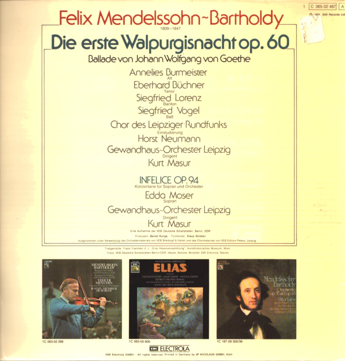 F. Mendelssohn-Bartholdy – Die erste Walpurgisnacht op. 60, Infelice op. 94 – Kurt Masur – Gewandhaus Leipzig (LP)