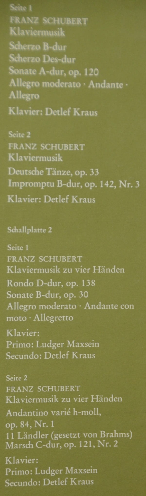 Sonaty fortepianowe Franza Schuberta w interpretacji Detlefa Kraussa i Eduarda Müllera. Repertuar kameralny w wykonaniu pianistycznym.