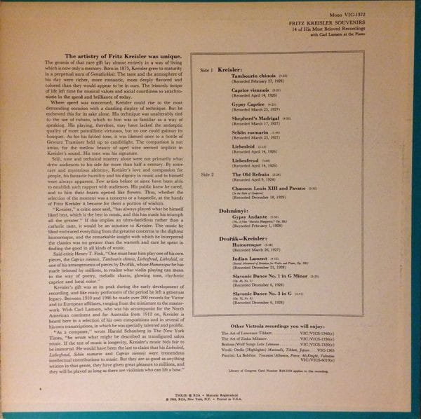 14 utworów Fritza Kreislera oraz tańce Dvořáka i Andante Dohnányiego w interpretacji samego Kreislera. Płyta mono — reedycja z lat 70. Stan płyty EX, okładka VG.