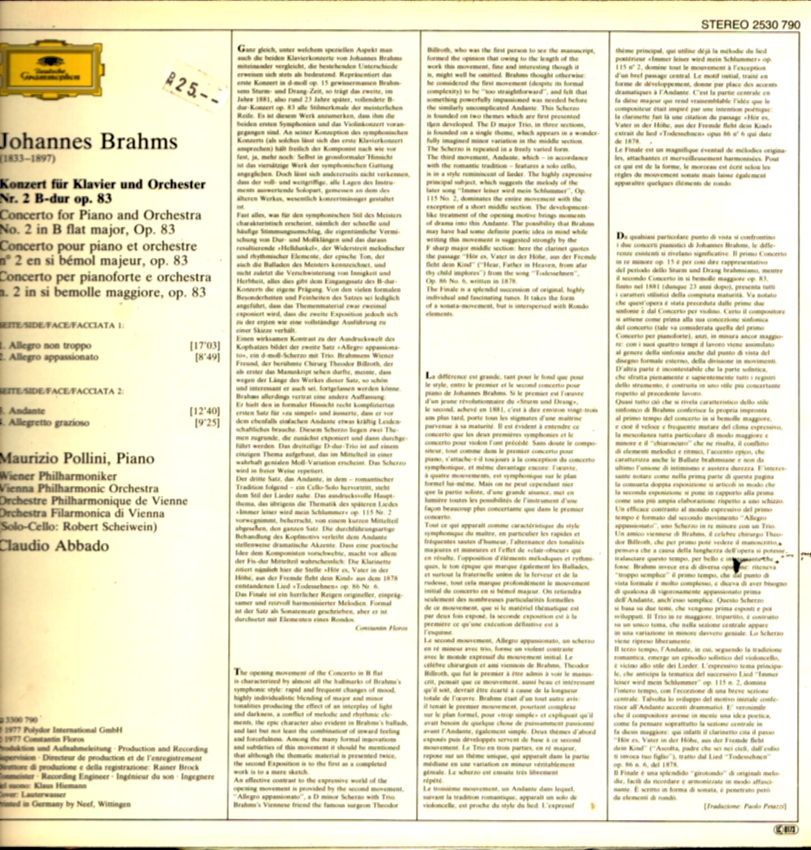 Nagranie z maja 1976 roku — Maurizio Pollini i Claudio Abbado z Wiedeńskimi Filharmonikami dla Deutsche Grammophon. Drugi Koncert fortepianowy Brahmsa w interpretacji, która od chwili premiery płyty w 1977 roku wyznacza punkt odniesienia w dyskografii tego dzieła. Pollini łączy intelektualną dyscyplinę z żarliwością, Abbado i Wiener Philharmoniker dopasowują się do niego z absolutną precyzją. Oryginalne tłoczenie DG, numer 2530 790. Egzemplarz z kolekcji Wojciecha Padjasa, autora audycji „Muzyka spod Igły” w RMF Classic.