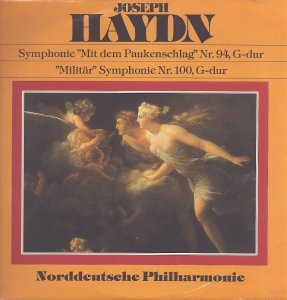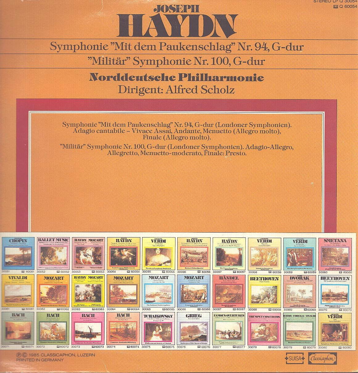 Dwie popularne symfonie Haydna z grupy londyńskich — „Niespodzianka" nr 94 i „Militarna" nr 100 — w wydaniu budżetowej serii Classicaphon. Dyrygent Alfred Scholz, Norddeutsche Philharmonie.