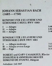 Małżeństwo wybitnych pianistów, Gaby i Robert Casadesus wykonują dwa podwójne koncerty Bacha. Towarzyszy im Kameralna Orkiestra z Zurychu pod batutą założyciela Edmonda De Stoutza.