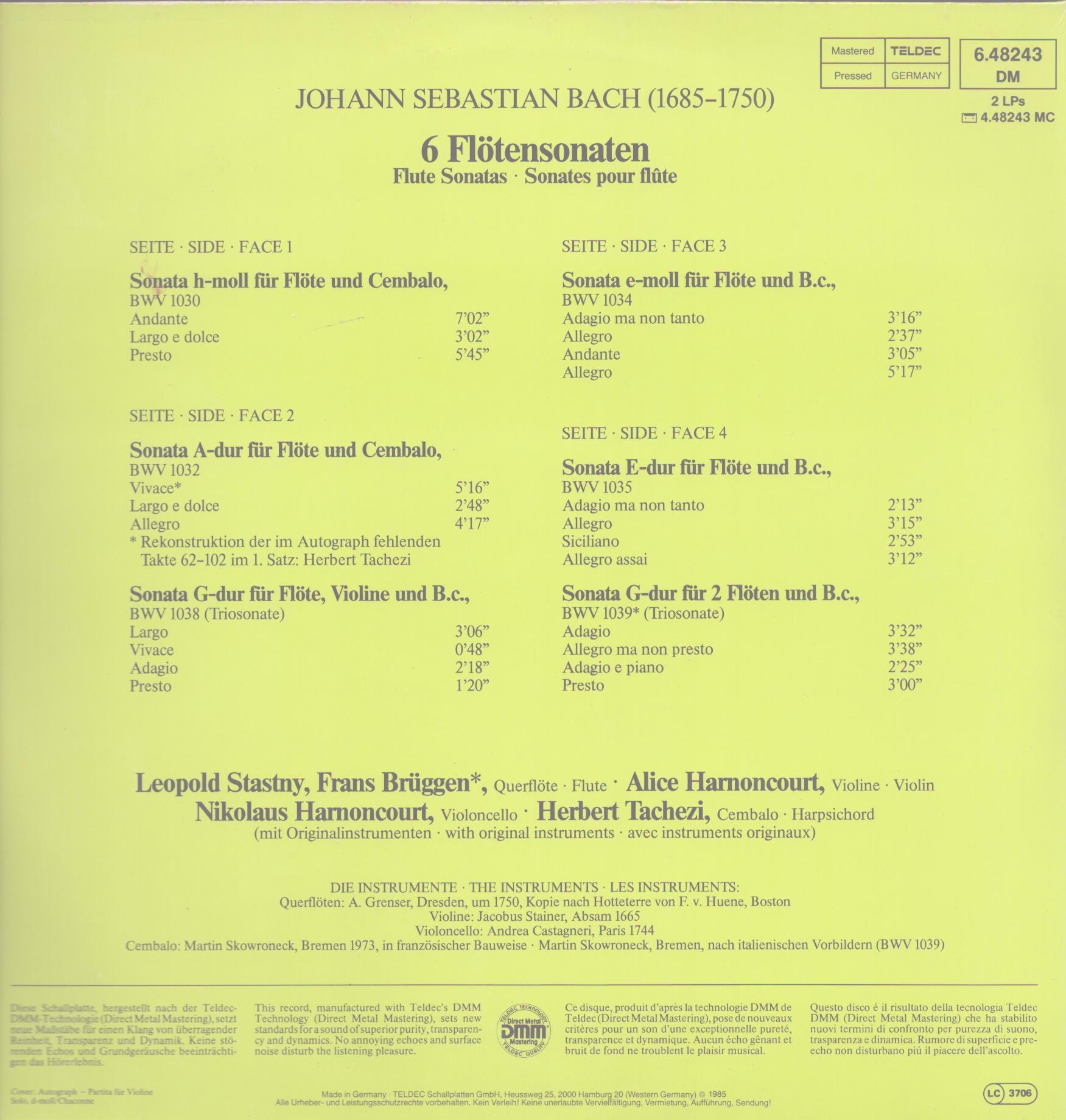 Jedno z wydawnictw upamiętniających 300 urodziny Bacha. Na płytach jest sześć sonat na flet. Frans Brügen był wybitnym holenderskim flecistą i kolekcjonerem barokowych, poprzecznych i prostych fletów. Idealne połączenie z Nikolausem Harnoncourtem (wiolonczela z epoki) specjalistą od muzyki dawnej i jej wykonywania na instrumentach z epoki.