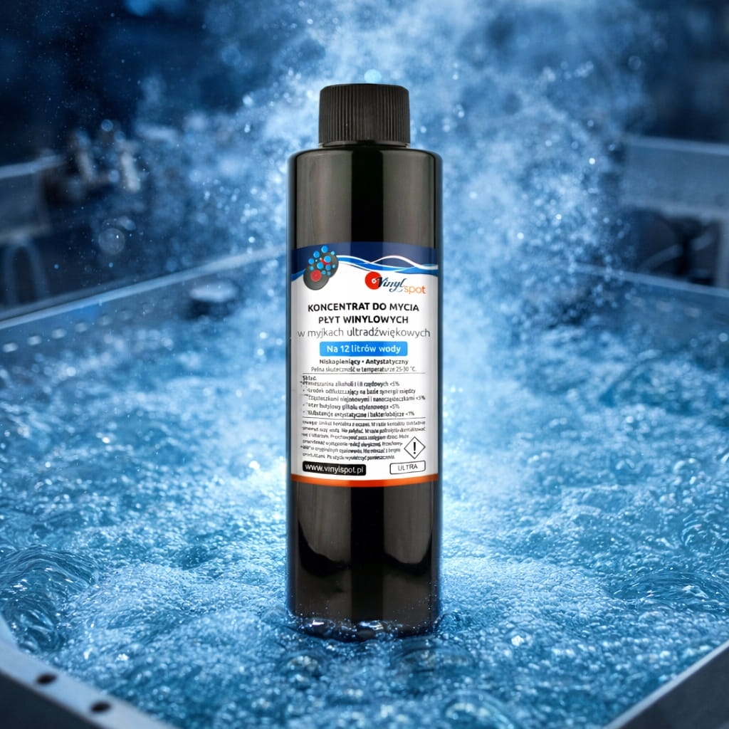 Kawitacja ultradźwiękowa — mikropęcherzyki implodujące w rowkach płyty — jest najskuteczniejszą metodą czyszczenia mechanicznego bez kontaktu fizycznego. Koncentrat Ultra ESD wspiera ten proces: niska lepkość ułatwia penetrację rowka, brak silnych środków pieniących zapobiega tłumieniu kawitacji przez pianę. Woda destylowana jako baza eliminuje minerały które po odparowaniu pozostawiają biały osad. Koncentrat rozcieńczyć do 6 l, wydajność ok. 50 płyt.