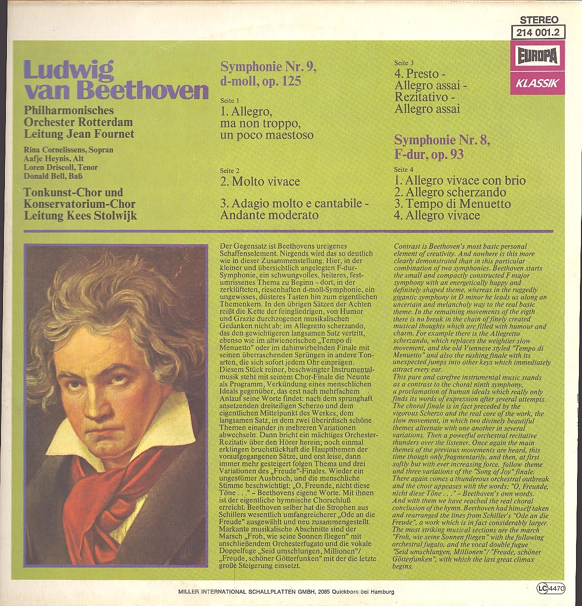 Dwa wielkie dzieła Beethovena na dwóch płytach w wydaniu budżetowej serii Europa Klassik. Symfonia nr 8 F-dur op. 93 i Symfonia nr 9 d-moll op. 125 z chórem i solistami. Dyrygent Jean Fournet, Orkiestra Filharmoniczna Rotterdam.
