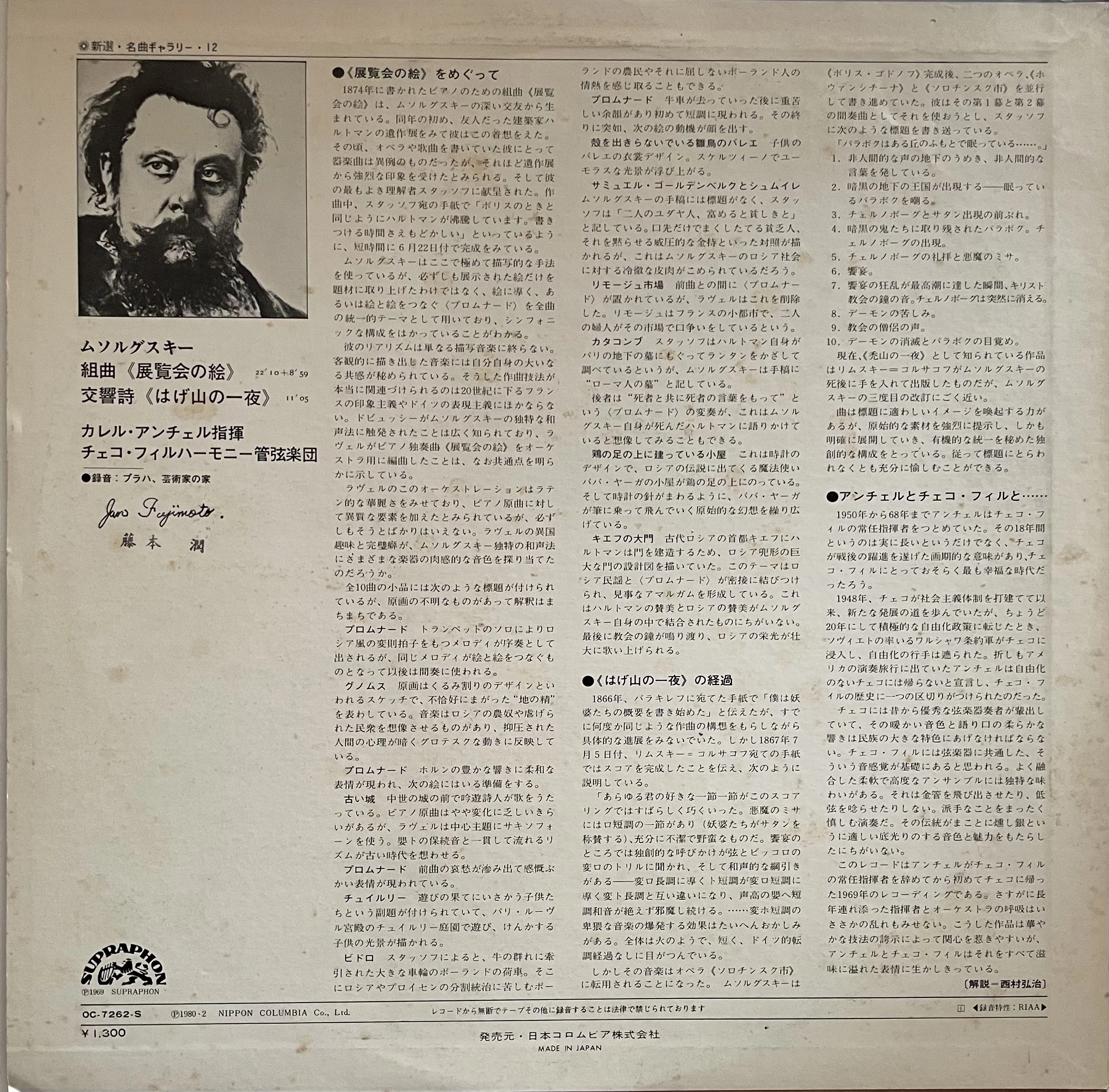 Karel Ančerl – jeden z największych dyrygentów czeskich XX wieku, ocalały z Holocaustu, który po 1948 roku uczynił z Czeskiej Filharmonii jeden z najlepszych zespołów Europy – nagrał Obrazki z wystawy Musorgskiego z dramatyczną intensywnością i orkiestrowym przepychem. W parze z Nocą na łysej górze tworzy to jeden z najciekawszych dokumentów jego współpracy z Czechami, zarejestrowany w japońskim tłoczeniu Columbia. Stan NM.