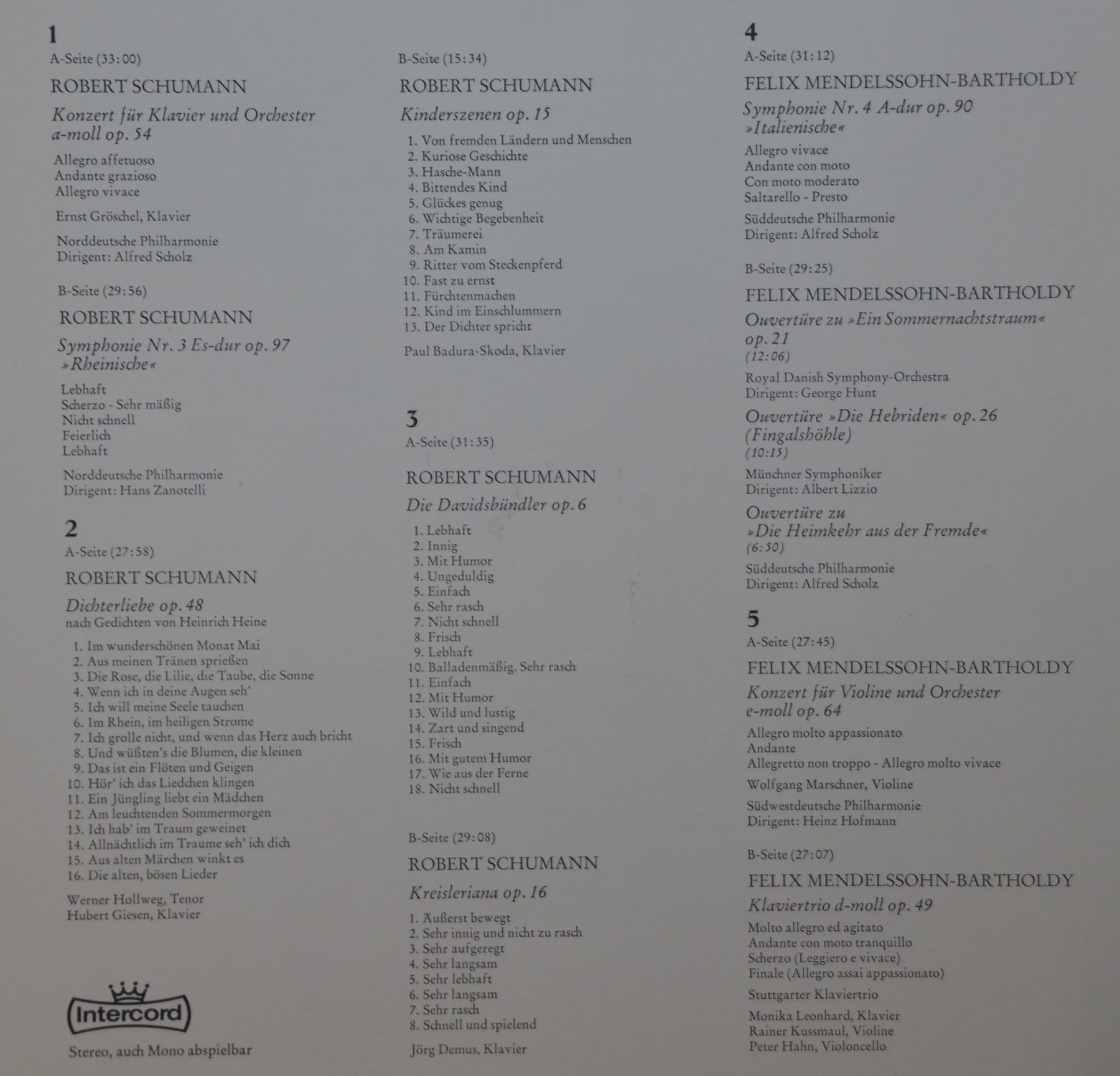 Zbiór utworów Felixa Mendelssohna i Roberta Schumanna w różnych wykonaniach. Wydanie INTERCORD.