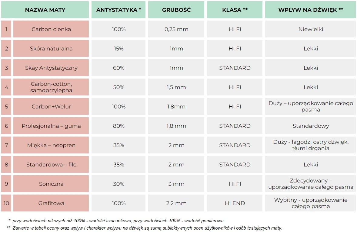 Materiał: skóra naturalna.Grubość: 1,4 mm.Średnica: 295 mm (standard LP 12").Powłoka: polimer antystatyczny.Antystatyka: 5/10.Wpływ na dźwięk: 5/10.Zastosowanie: wymiana maty gumowej bez zmiany VTA.