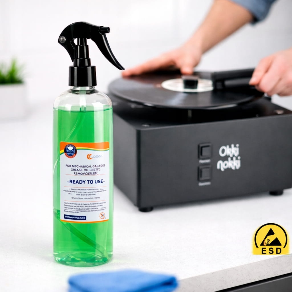 Masz myjkę ssącą z odkurzaczem — Okki Nokki, Pro-Ject VC, Clearaudio Matrix — i potrzebujesz płynu który nie zatknie ssaka pianą i nie zostawi śladów po odsysaniu. Ten płyn jest sformułowany dokładnie pod te wymagania.