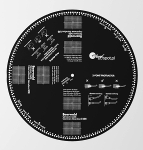 Płyta zawiera trzy wersje szablonu 2-point protractor według geometrii Baerwald (Löfgren A): Baerwald IEC — standard międzynarodowy (punkty zerowe 63,103 / 119,173 mm); Baerwald DIN — standard niemiecki (punkty zerowe 60,325 / 114,905 mm); Baerwald JIS — standard japoński (punkty zerowe 63,218 / 119,492 mm). Wybór standardu zależy od gramofonu — większość europejskich i amerykańskich producentów stosuje IEC, japońskie modele vintage często wymagają JIS.