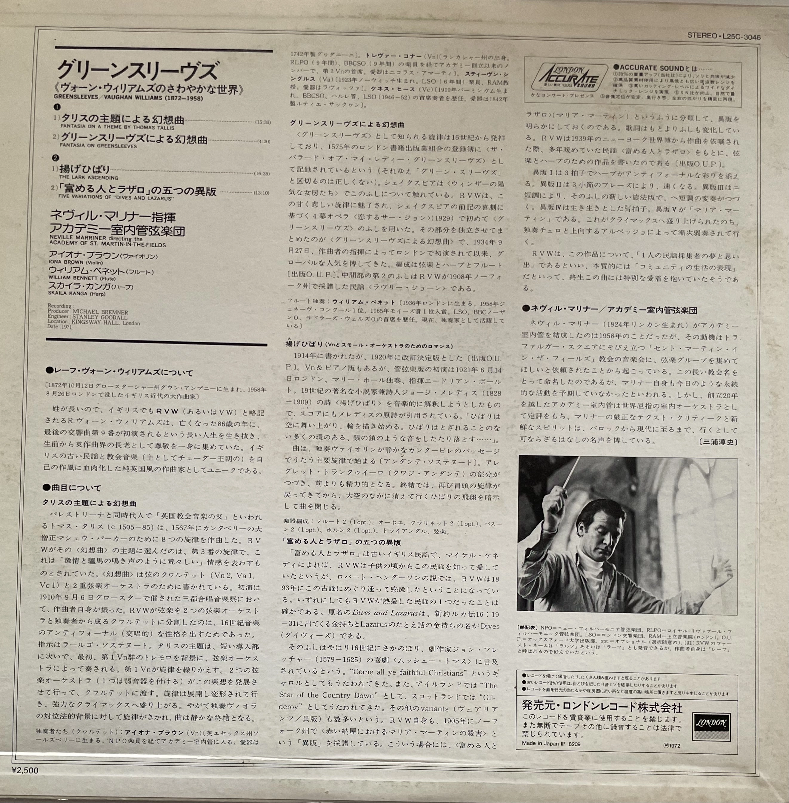 R. Vaughan Williams – Greensleeves / Fantazja Tallisa / Lot skowronka – Marriner – Academy of St. Martin-in-the-Fields (LP) \japan