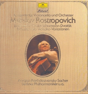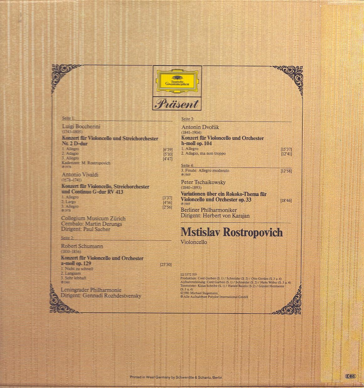 Mstisław Rostropowicz był największym wiolonczelistą XX wieku — i jednym z tych artystów, dla których kompozytorzy pisali specjalnie, bo wiedzieli, że nikt inny nie zagra tego lepiej. Ten album to przekrój jego kameralnego i orkiestrowego mistrzostwa: Boccherini, Vivaldi, Schumann, Dvořák i Wariacje Rokokowe Czajkowskiego — pięć dzieł, pięciu dyrygentów, dwie płyty. Karajan prowadzi Berliner Philharmoniker w Czajkowskim, Rozhdestvensky staje za pulpitem w Schumannie z Leningradzką Filharmonią, Paul Sacher dyryguje Collegium Musicum Zürich w Vivaldim. To nie jest składanka — to dokumentacja wszechstronności artysty na szczytowym etapie kariery. Wydanie DG Präsent, stan EX. Egzemplarz z kolekcji Wojciecha Padjasa — autora audycji „Muzyka spod Igły” w RMF Classic.