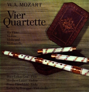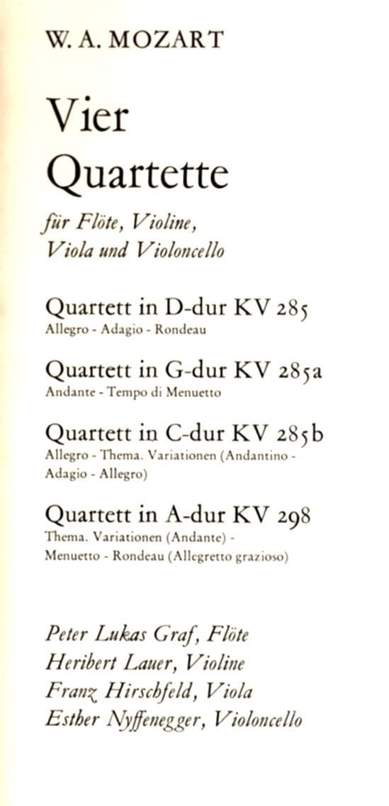 Kwartety Mozarta na flet, skrzypce, altówkę i wiolonczelę w wykonaniu szwajcarskich muzyków. Na wilonczeli gra Esther Nyffenegger studentka Pablo Casalsa. Wydanie szwajcarskie. Stan płyty i okładki NM.