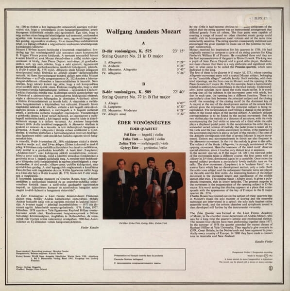 Świetne kwartety Mozarta.Kwartet nr.21 jest trochę w stylu Haydna,co oczywiście nie umniejsza jego doskonałości. Doskonałe tłoczenie Hungarotonu z 1982 roku.Stan płyty i okładki NM. Kwartet smyczkowy D-dur, K, 575 = Kwartet smyczkowy nr 21 D-dur, (23:15) A1 I. Allegretto 7:28 A2 Andante II 4:36 A3 III. Menuetto. Allegretto 5:45 A4 IV. Allegretto 5:26 Kwartet smyczkowy H-dur, K, 589 = Kwartet smyczkowy nr 22 B-dur (22:40) B1 I. Allegro 6:07 B2 Larghetto II 6:33 B3 III. Menuetto. Moderato 6:28 B4 IV. Allegro Assai 3:32 Wiolonczela - György Éder Skomponował - Mozart Zespół - Éder Quartet Altówka - Zoltán Tóth Skrzypce - Erika Tóth, Pál Éde r.