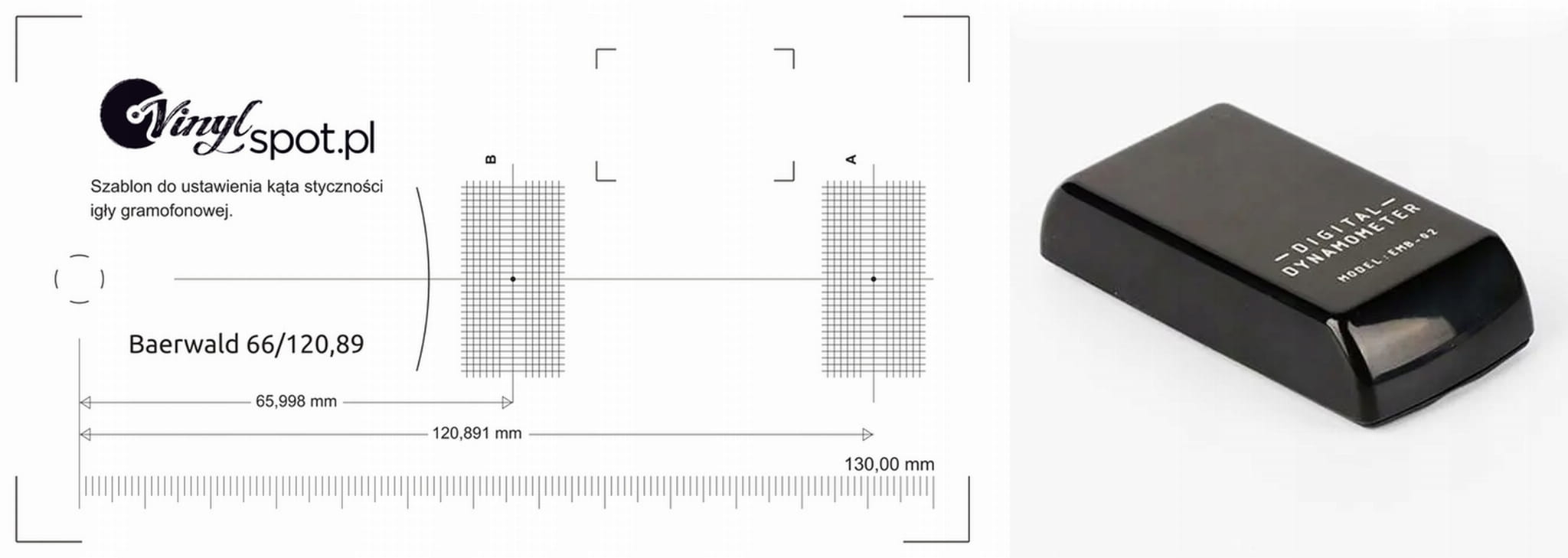 Precyzyjny szablon do ustawiania overhang i geometrii wkładki metodą 2-point protractor. Geometria Baerwald (Löfgren A) to standard minimalizujący błąd śledzenia na całej długości rowka, stosowany przez większość europejskich i amerykańskich producentów gramofonów.