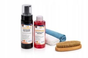 Ratowanie bardzo zaniedbanych płyt — 4-etapowy proces bez myjki zastosowanie: zestaw interwencyjny do płyt z pleśnią, biofilmem, silnym zabrudzeniem organicznym.Przeznaczenie: płyty winylowe PVC — przypadki niereagujące na standardowe metody.Zawartość: pianka 150ml + amoniak 100ml + płyn finiszowy 150ml + szczotka z włosia dzika + 3 ściereczki.Pianka: pH ok. 9, czas działania 2–3 minuty.